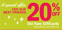 This is almost a deal too good to be true. Through December 24th – Old Navy is giving a discount of 20% on gift cards purchased up to $300. And what is even better is that you can use your new discounted gift card in conjunction with all of the % off coupons to make an even better deal in-store or online.