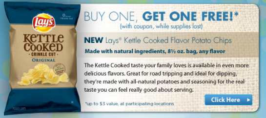 Become a Fan of BeSnackReady on Facebook and print off a coupon good for a FREE Lays Kettle Chips when you purchase a Lays Kettle Chips.