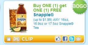 Update: There is an additional coupon available on Facebook. Become in “Like” with Snapple and click the “Ice Tea Day” tab and you can print off another set of Buy One, Get One FREE Snapple coupon..